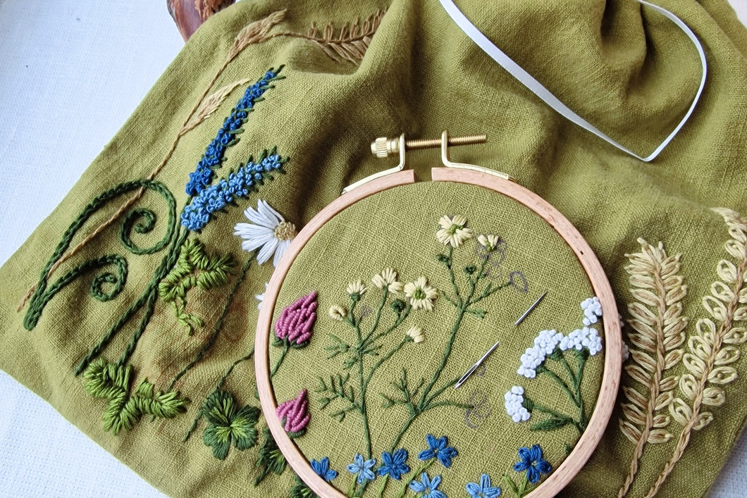 Materialpakke med opptak av webinar - Lær broderi med prosjektbag markblomst